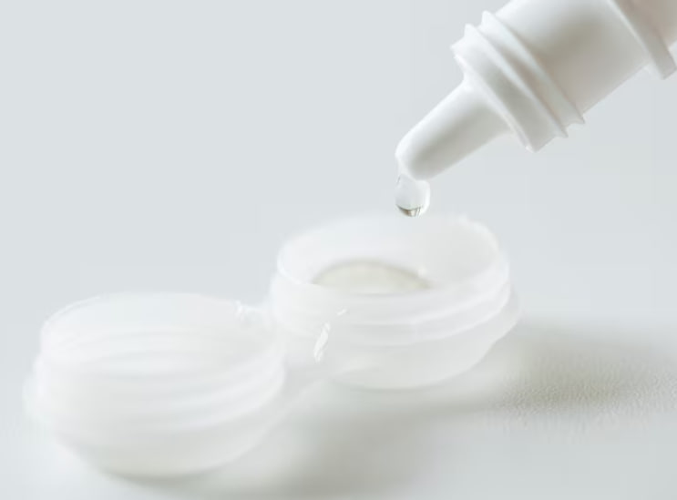 - Розгляньте наявність контактних лінз. Для носіїв лінз існують спеціальні формули, сумісні з матеріалами лінз; інколи рекомендують знімати лінзи і закапувати засіб, потім почекати перед поверненням лінз.